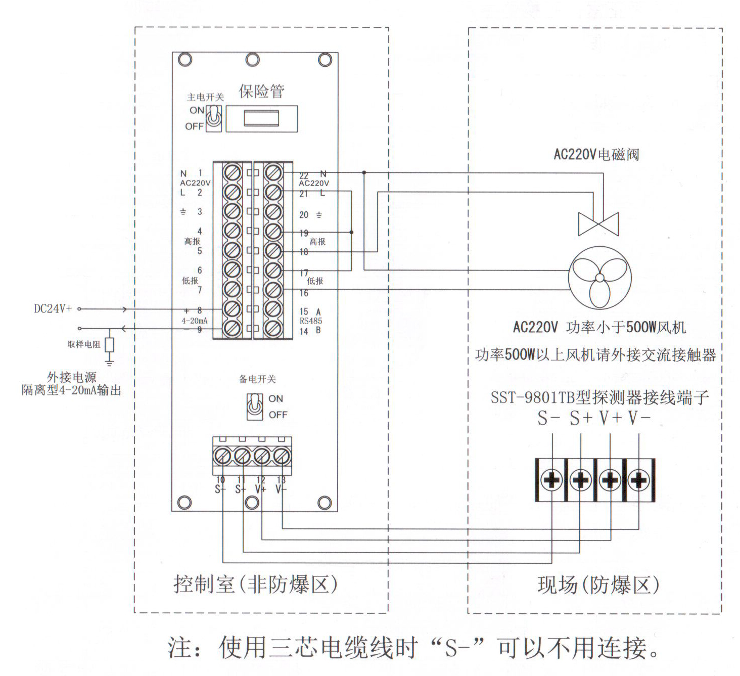 - SST-9801B-P氣體報警裝置為防爆型儀表,其組成為兩個部分:探測器與報警控制器,探測器(一次表)安裝在可能有氣體泄漏的危險場所,其核心元件為氣敏傳感器;報警控制器(二次表)安裝在安全場所的值班室內。