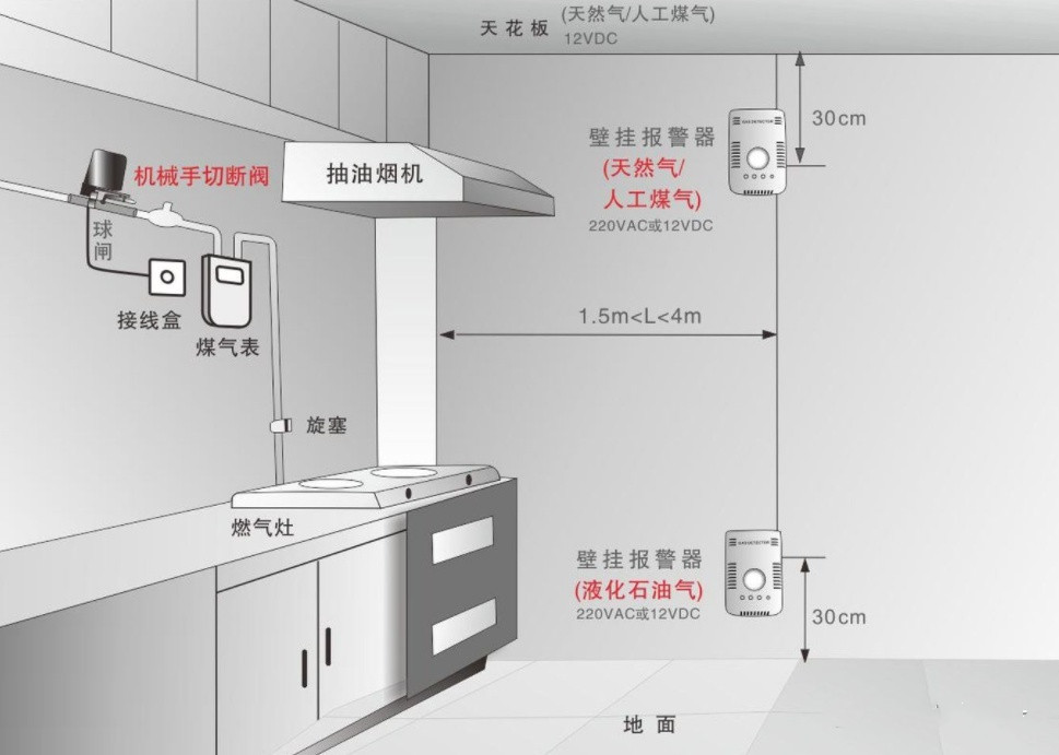 報警裝置應安裝在氣源下部泄漏易聚集處,一般距建筑地面30厘米,與燃氣灶之間的距離1 m≤ L≤4 m為宜。